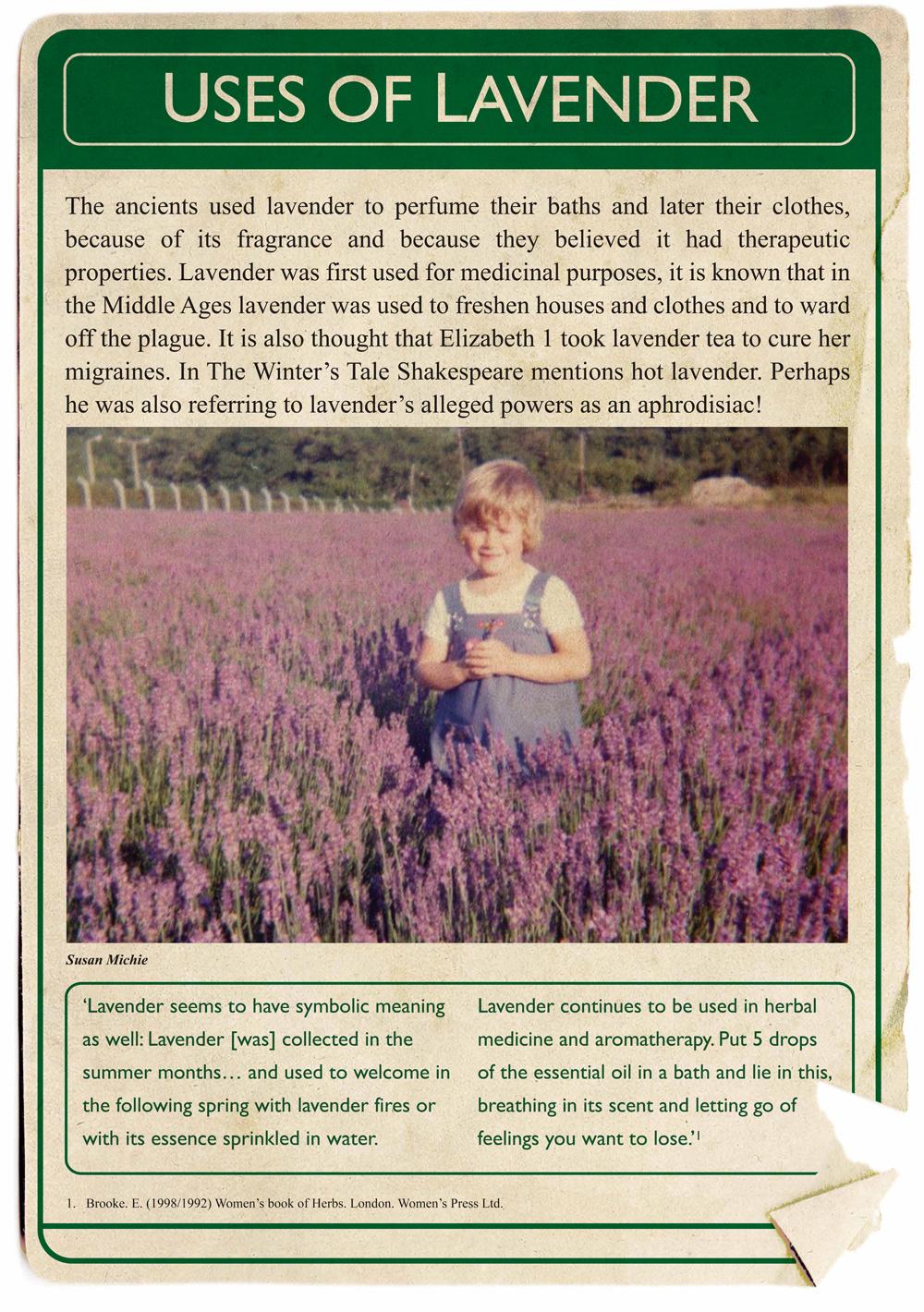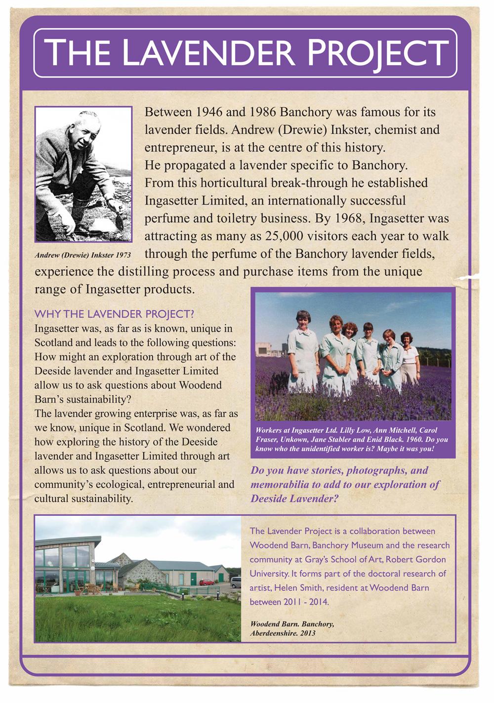 The possibility of Lavender as a subject began for me as a conversation in the bar on the evening of Fiona’s birthday, (November 2012) after a Woodend Barn Music Society event. This was the first time I had heard anyone mention Banchory Lavender. Tony and Christina were telling a small circle of friends about how they had recently heard that it grew commercially in fields that could be seen from the North Deeside Road. I seem to remember a shared moment of imagining the affect of both the site and smell of fields of lavender.