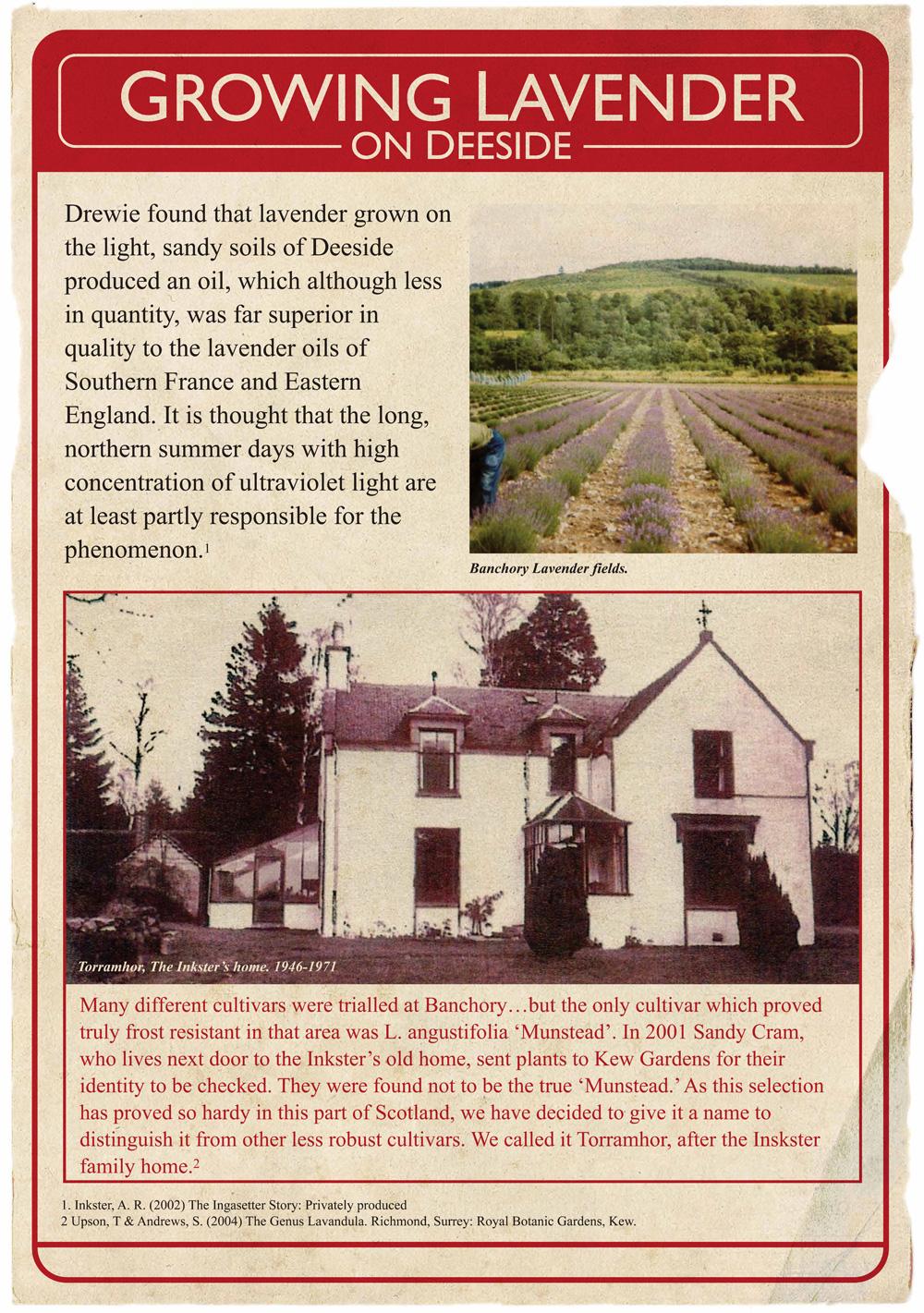 Tim Upson and Susyn Andrews in their taxonomy of ‘The Genus Lavandula’ identified a cultivar of Lavender, developed commercially by Chemist, Andrew (Drewie) Inkster, that is specific to Banchory. Once this subject was agreed the group met regularly to uncover the reasons why lavender thrived ecologically and commercially on Deeside from 1946 until it ceased trading in 1989.